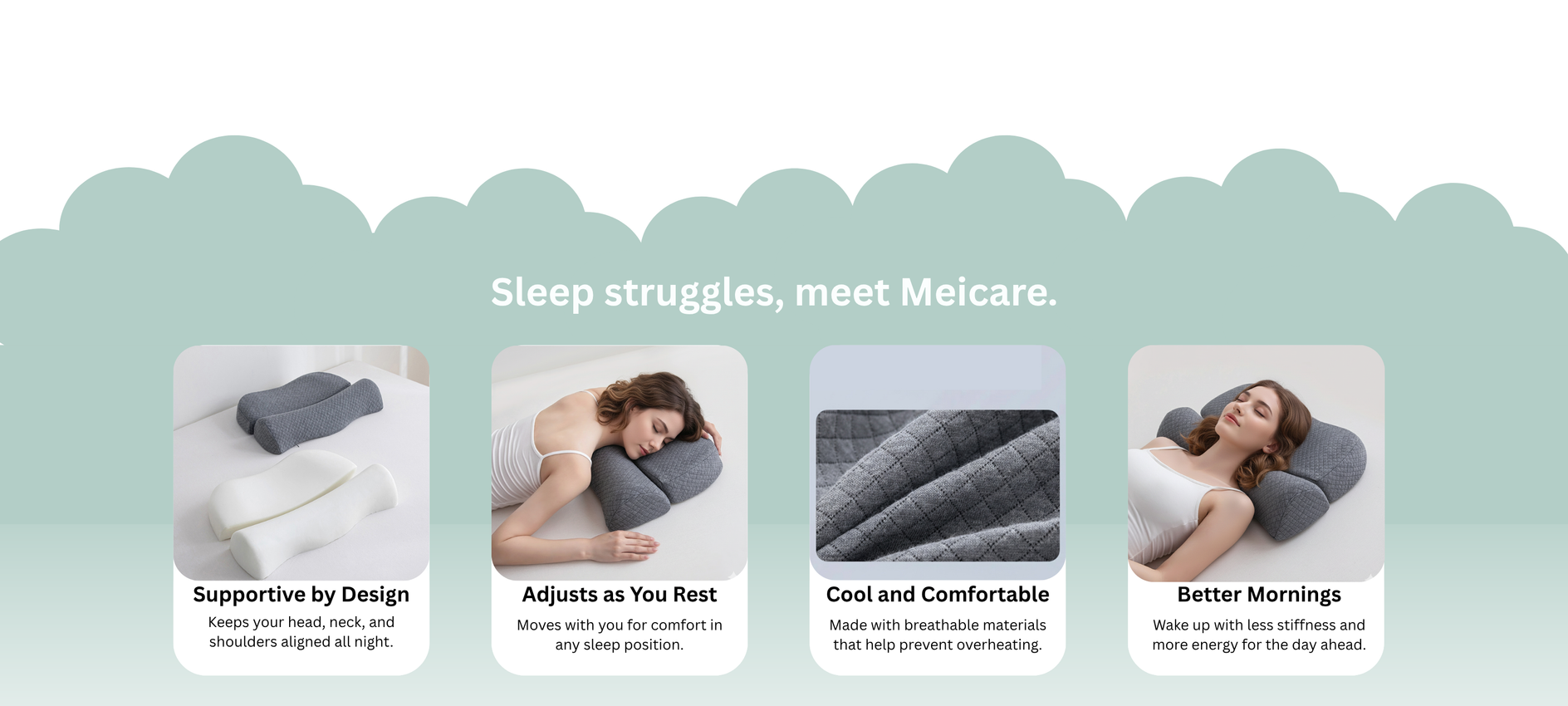 Our Meicare Pillow Collection is made for every sleeper. Designed to support your head and neck in any position, it helps you rest in natural alignment. Breathable materials keep you cool and comfortable — because no two sleepers are the same.